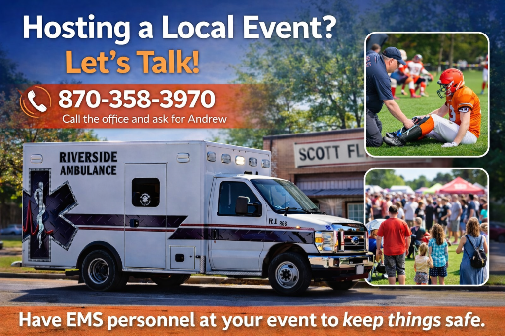 Riverside Ambulance proudly serves communities across Poinsett County, Arkansas with emergency ambulance response, medical transport, event standby, CPR training, and community outreach.